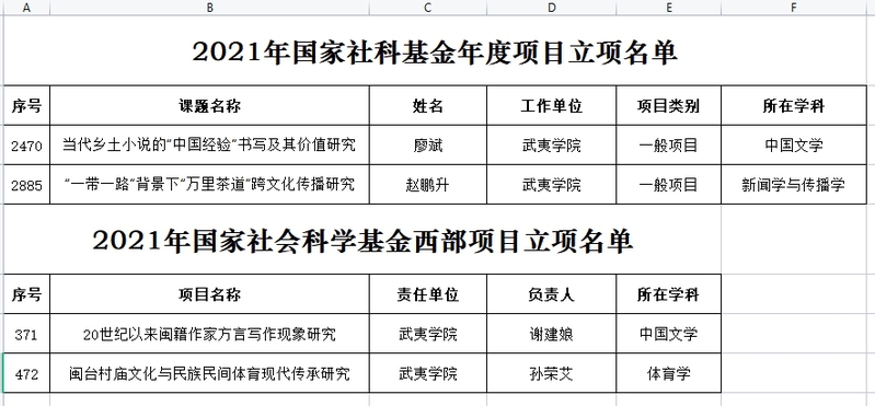 日前,全国社科规划办公示了2021年度国家社科基金年度、青年和西部项目立项名单,我校4个项目榜上有名,立项数位于全省同类院校前列。其中,人文与教师教育学院廖斌教授申报的“当代乡土小说的‘中国经验’书写及其价值研究”课题和赵鹏升副教授申报的“‘一带一路’背景下‘万里茶道’跨文化传播研究”课题获批一般项目,体育教学部孙荣艾教授申报的“闽台村庙文化与民族民间体育现代传承研究”课题和人文与教师教育学院谢建娘博士申报的“20世纪以来闽籍作家方言写作现象研究”课题获批西部项目。